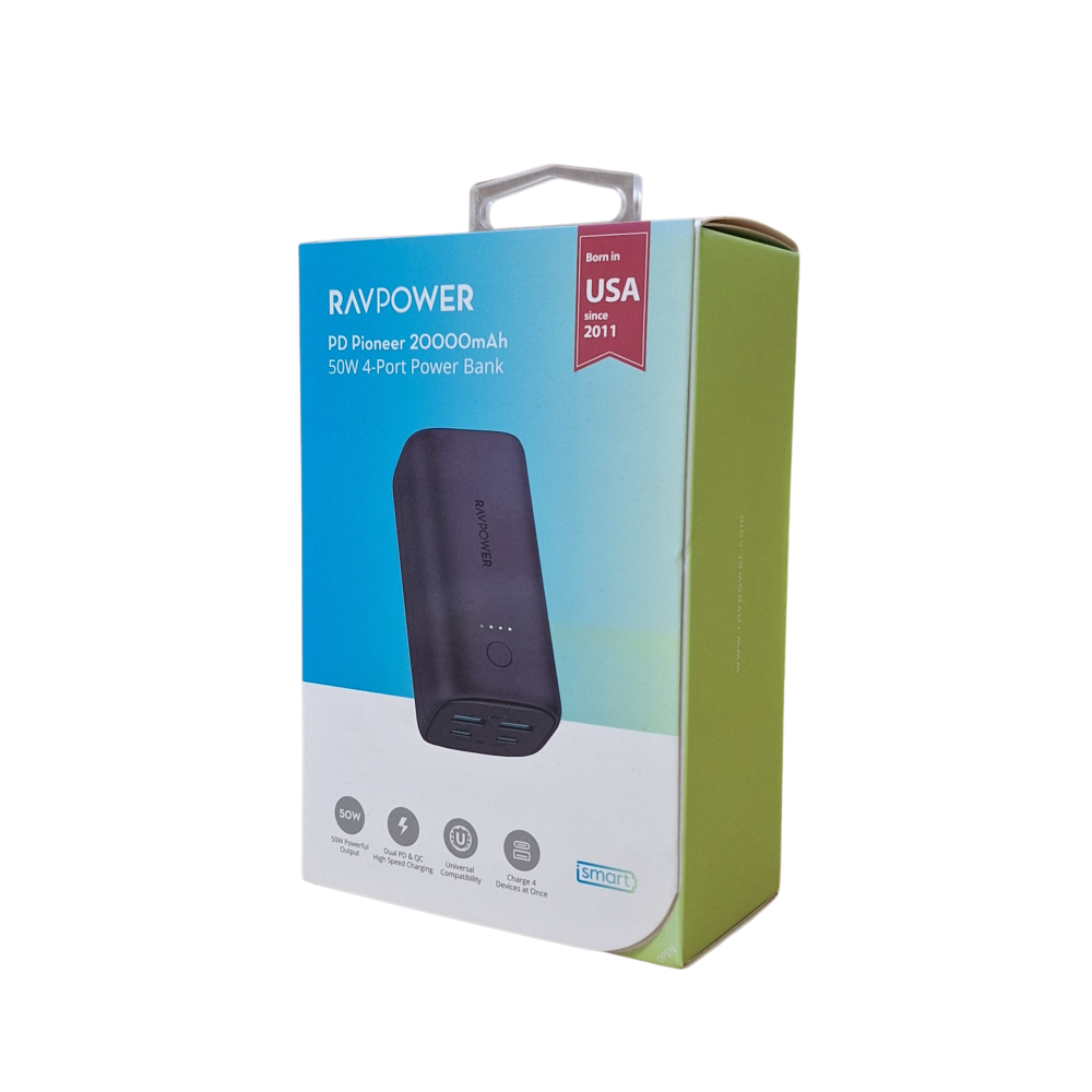 الآن يمكنك الاستمتاع بأجهزتك الذكية بلا حدود مع RAVPOWER - باور بانك اسود 2000W اربعه منافذ USB+PD م/ PC-208 ماركة راف باور، المتطورة.